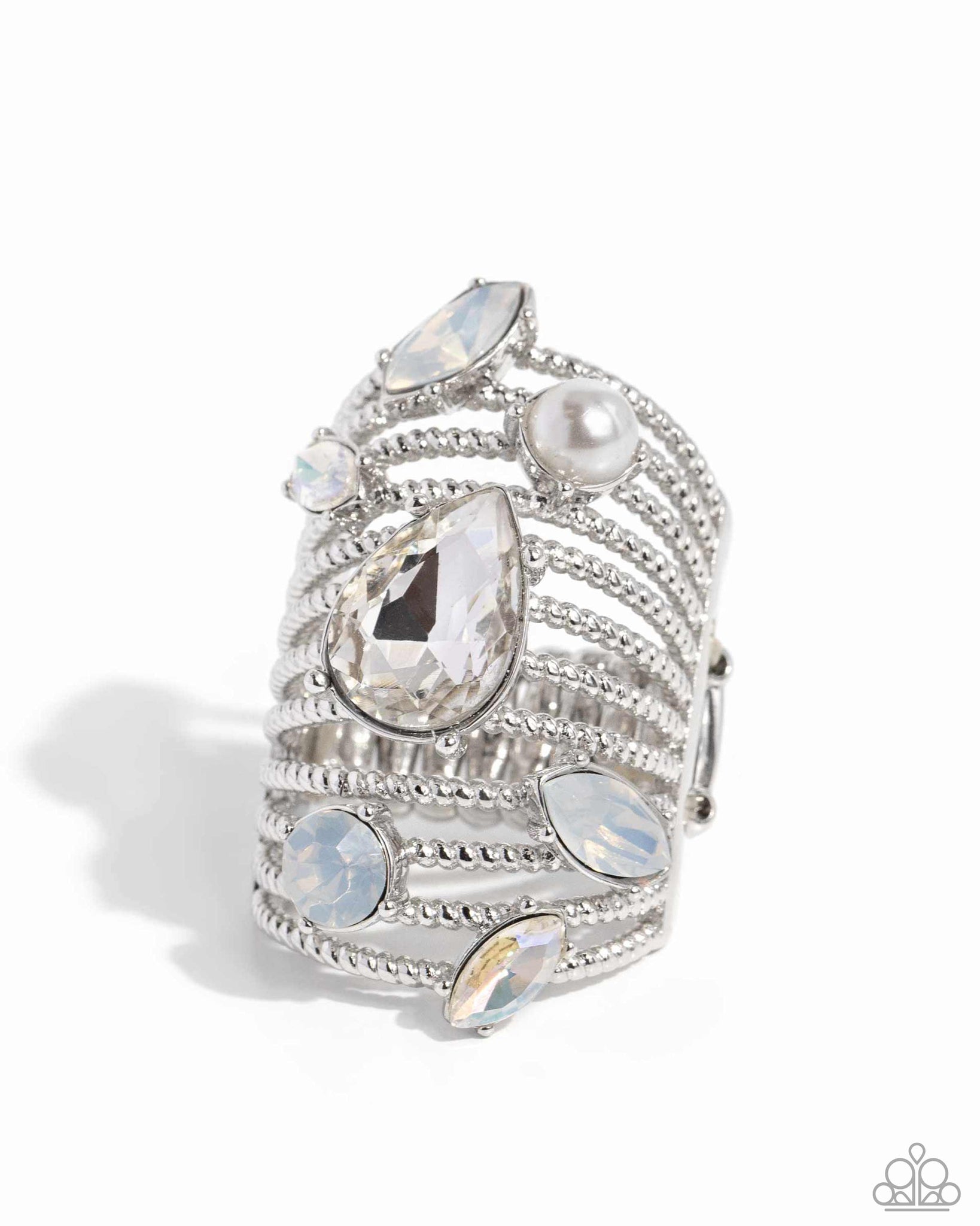 Featuring a dazzling array of round, teardrop, and marquise-cut gems, pearls, and rhinestones in multicolored white hues, row after row of twisted silver bands stack up and across the finger for a knockout look. Features a stretchy band for a flexible fit.