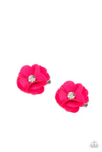 Textured pink petals bloom from a glittery white rhinestone center, creating a charming pair of colorful blossoms. Each flower features a standard hair clip on the back.