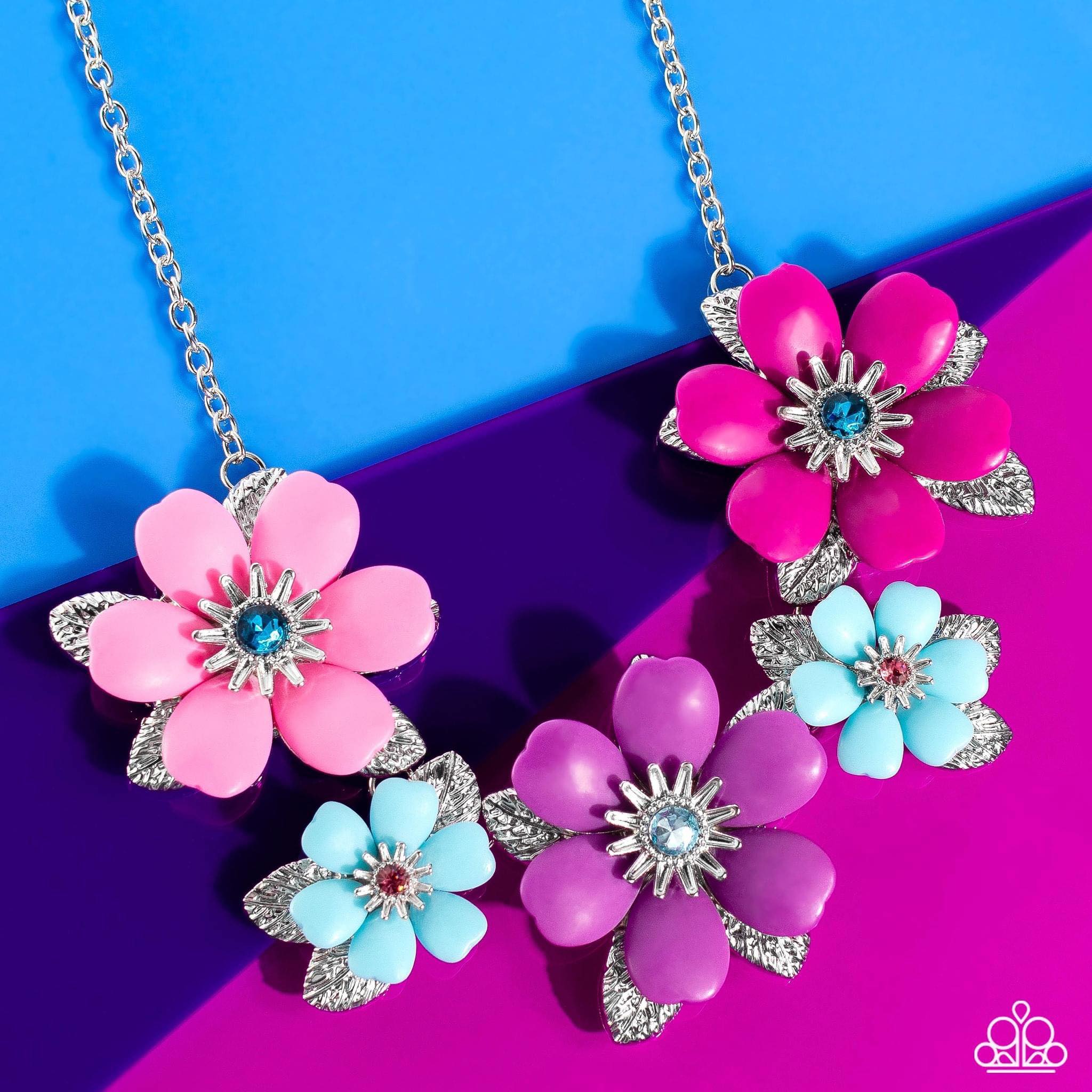 Dotted with dainty Harbor Blue, aquamarine, and rose rhinestone centers, dainty silver flowers bloom against a backdrop of glossy acrylic flowers in Aurora Pink, Rose Violet, Cattleya Orchid, and Spun Sugar hues. Each flower, varying in size, blossoms across a textured collection of silver leaves below the collar, invoking a festive spirit. Features an adjustable clasp closure.