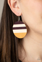 The front of a shiny wooden disc is stripped in purplish-brown and yellow accents, creating a colorful summery look. Earring attaches to a standard fishhook fitting.